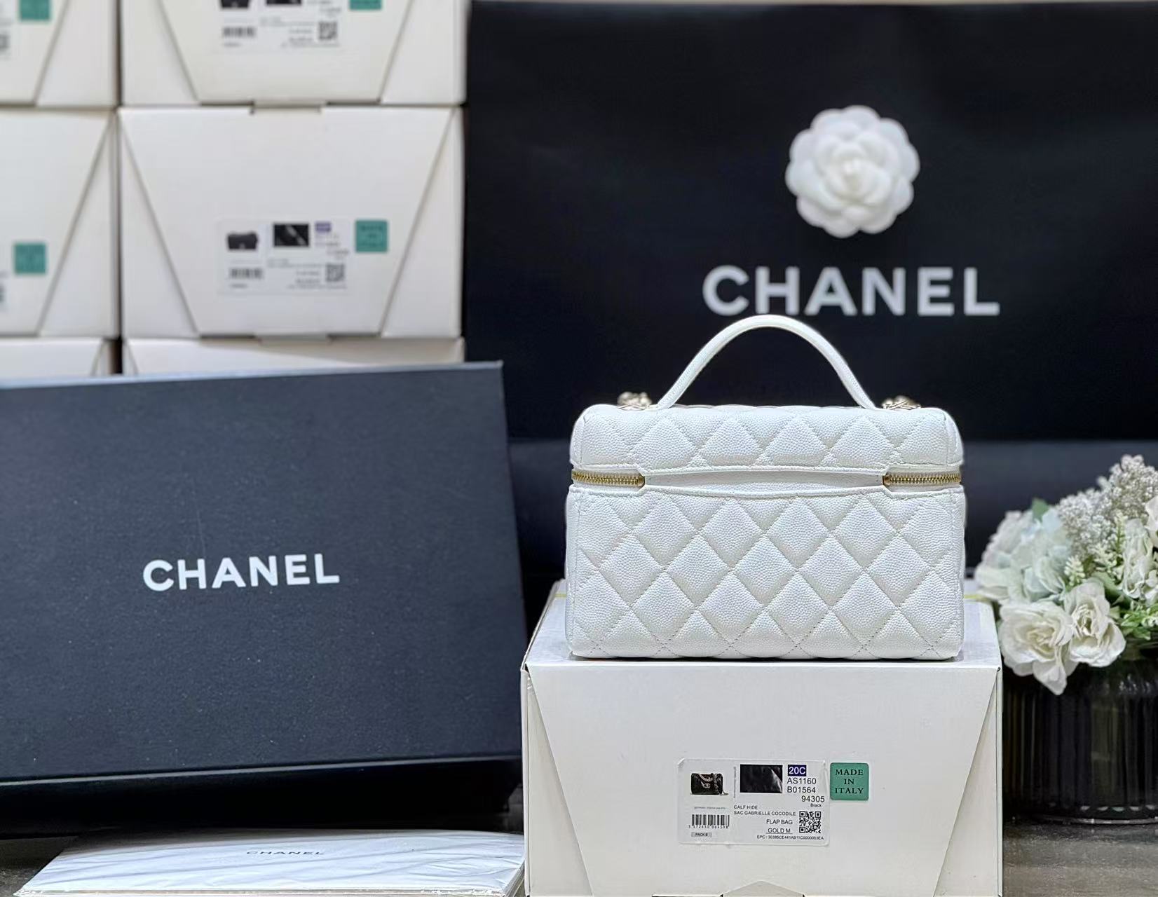 STRASS VANITY QUILTED CASE 19 IN WHITE CALFSKIN WITH GOLD METALLIC